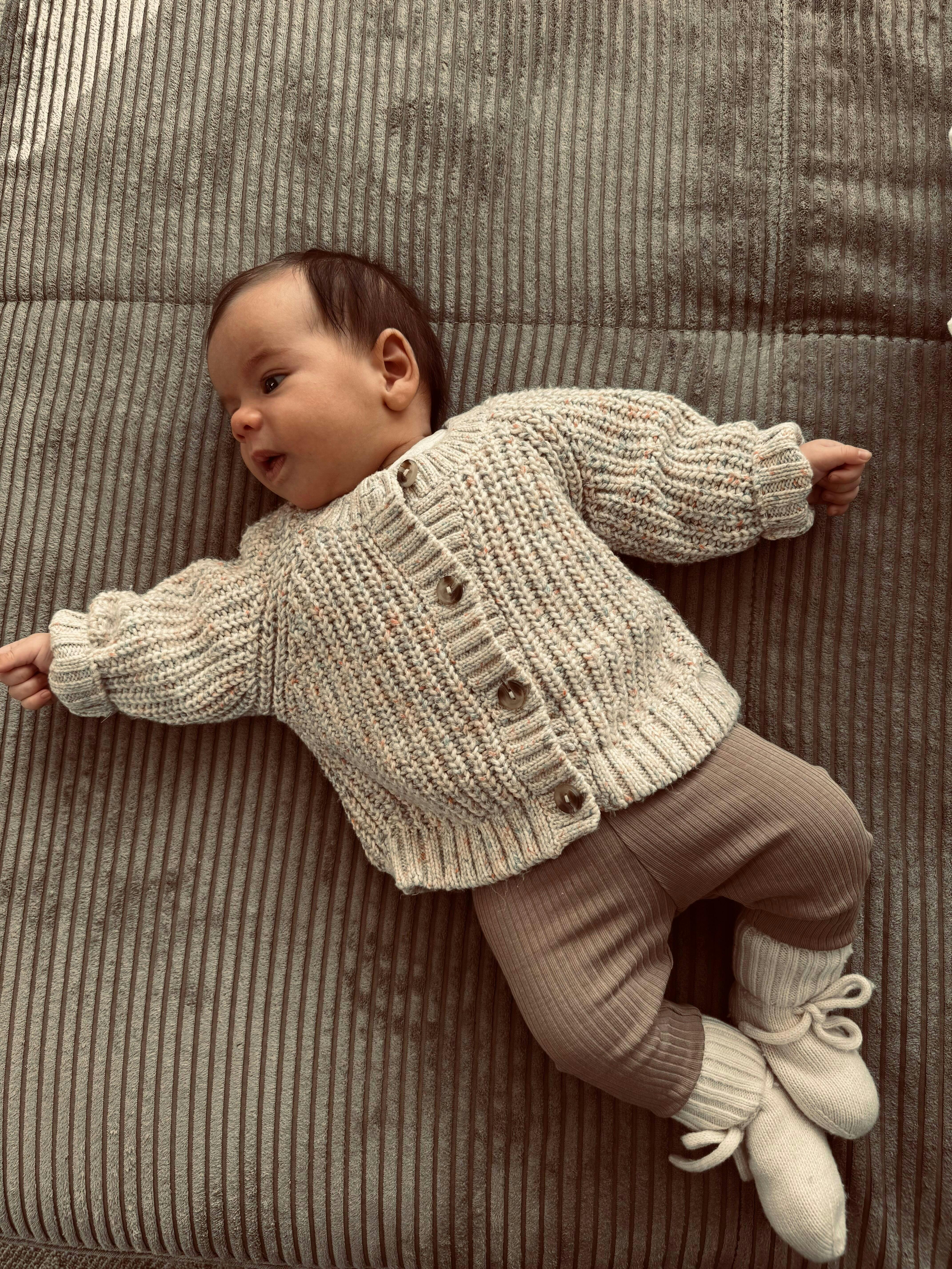 Baumwolle ist weit verbreitet, aber nicht immer die beste Option für empfindliche Babyhaut. Deshalb setzen wir bei unseren Strickprodukten bewusst auf Merinowolle – eine Faser mit erstaunlichen natürlichen Eigenschaften. Merinowolle bietet deinem Baby maximalen Komfort, reguliert die Körpertemperatur optimal und sorgt für ein sanftes, geborgenes Gefühl. Gleichzeitig gibt sie dir als Elternteil die Sicherheit, dass dein Kind sich rundum wohl fühlt – von den ersten Tagen an.